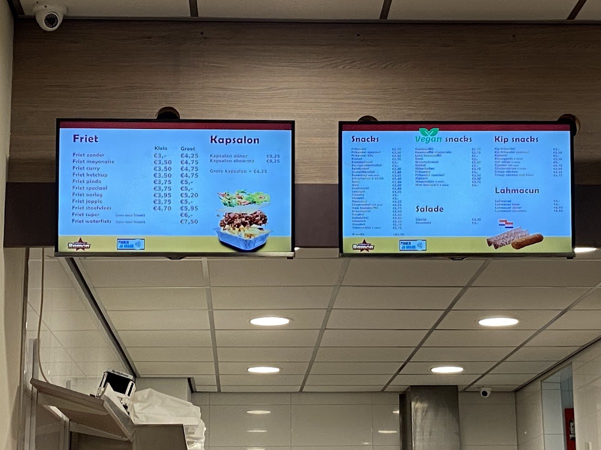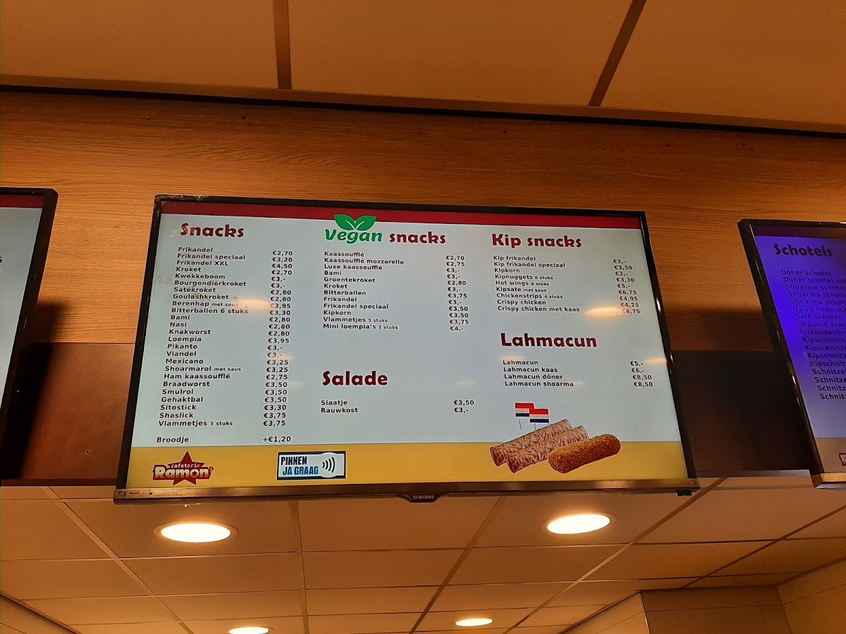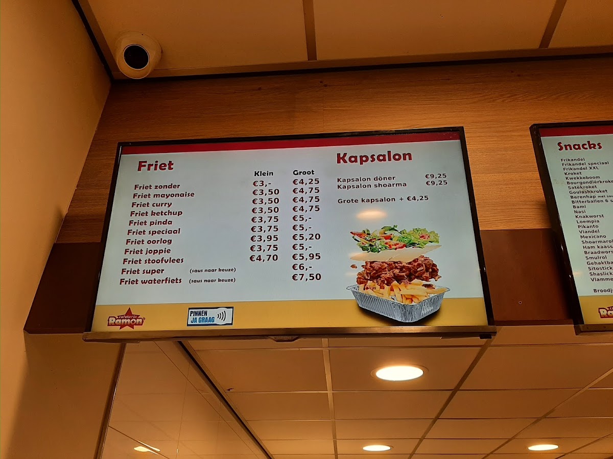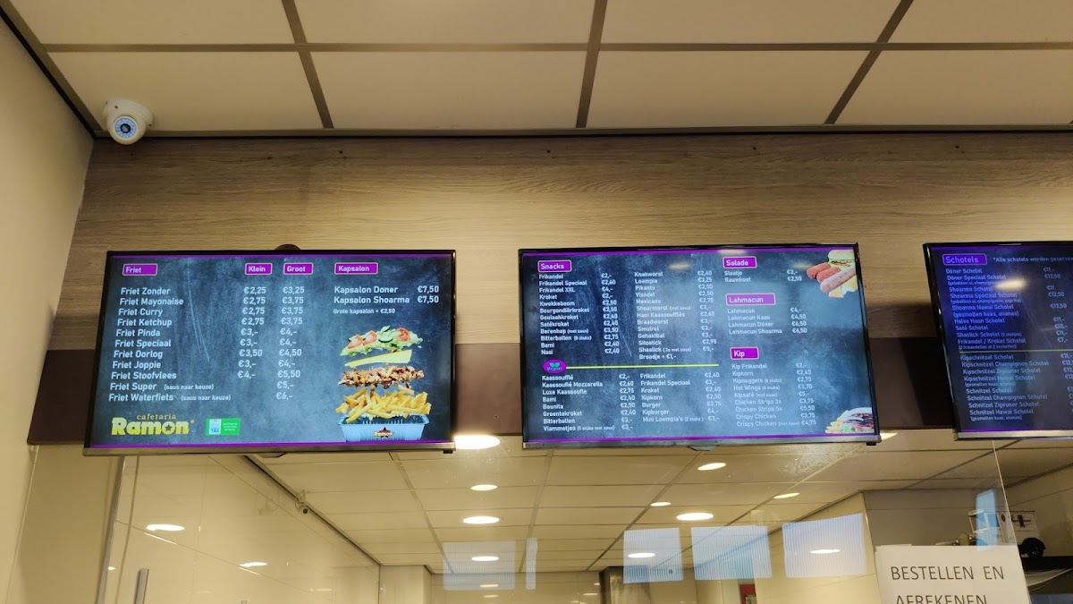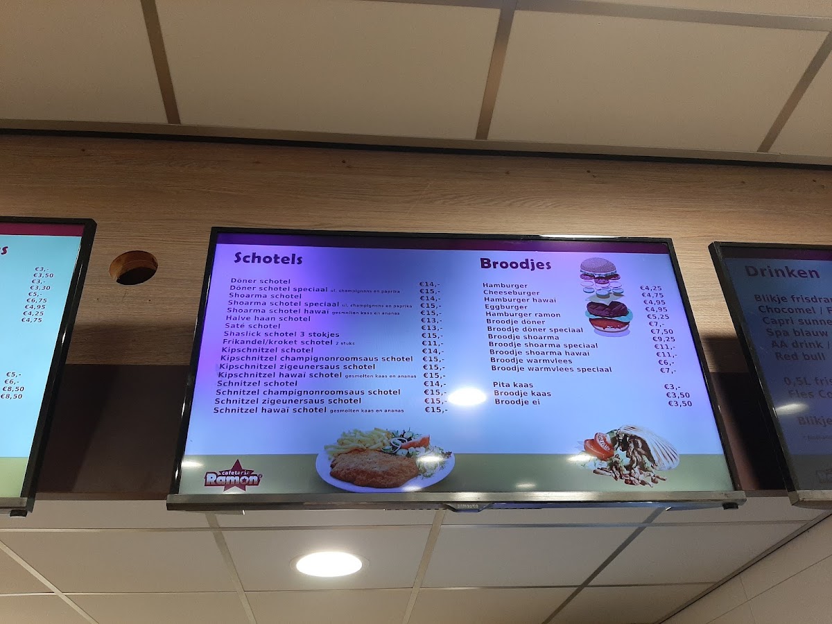 The menu at Cafetaria Ramon focuses on typical cafeteria offerings, including a variety of fried snacks and quick-service meals. The food selection includes items such as shoarma (shawarma), döner (donair), and other fast-food staples commonly found in snackbars. Customers can expect options suitable for light meals or casual dining, ideal for takeaway or eating on-site with limited seating available.